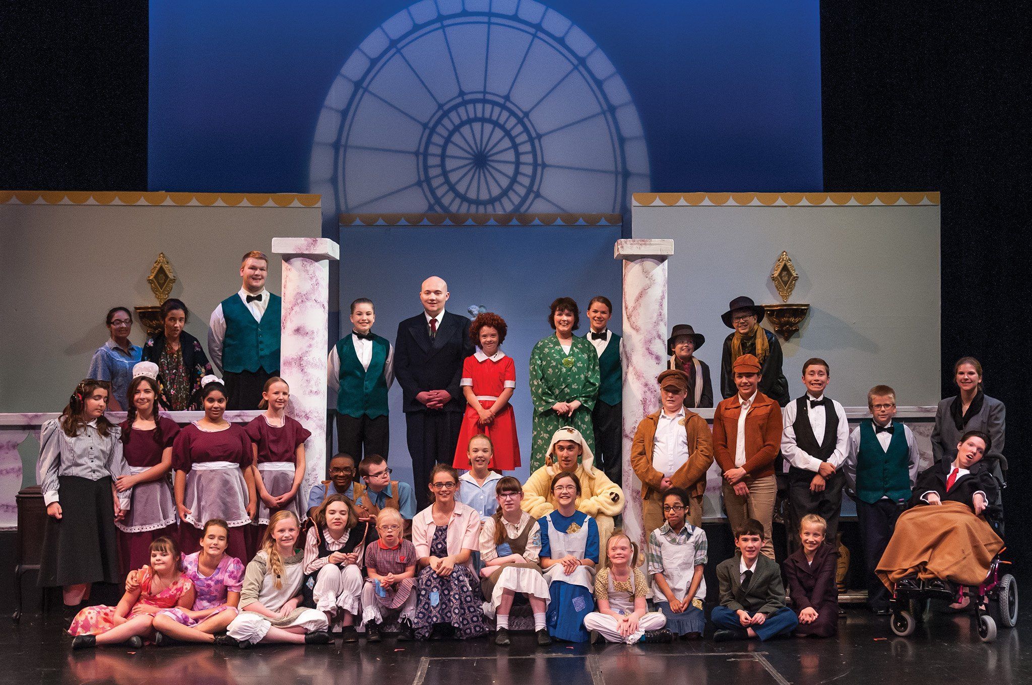 From a Chapter Administrator: “From the reaction of our audience, I believe wholeheartedly that they understood the major achievement that was happening on our stage. The simple visual of the pairing of an Artist in the foreground with a Mentor behind them, the Mentor sliding in unobtrusively to prompt a line or manage a prop or guiding a wheelchair spoke volumes. Among the laudatory comments I heard were many that cited the relationship between the Artist and Mentor. Our audience saw the human connection being made, kindnesses shown and shared joy exploding from the stage. An image from this show I will never forget occurred during our last two performances. During curtain call, Christian, Sarah, Kristoff, and Eva (Warbucks, Grace, and Mentors) spontaneously grabbed hands, walked down stage as a foursome, and took their bow together. What sold me on the Penguin Project was the Artist/Mentor relationship and there it was front and center.”